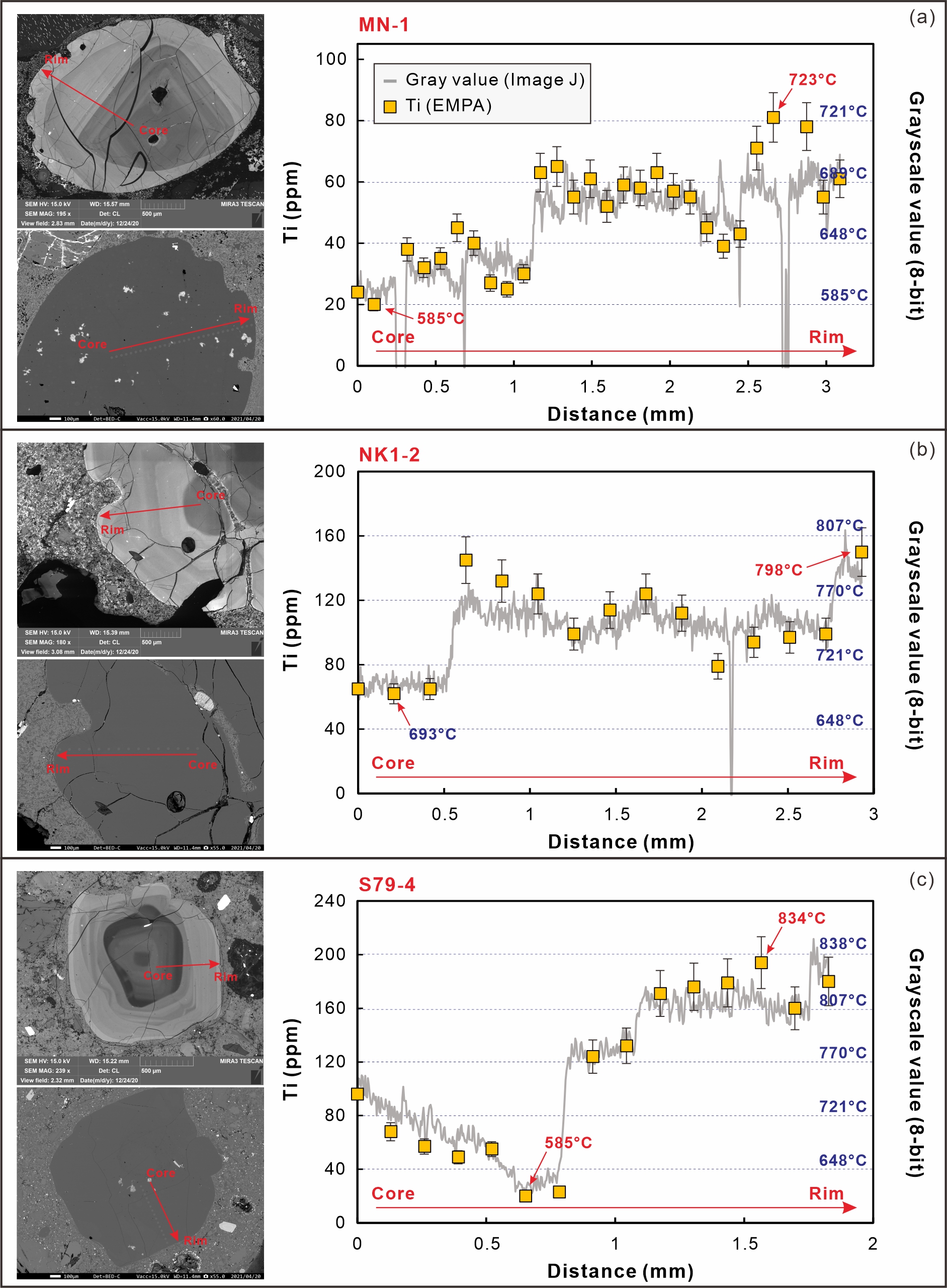 图1 石英斑晶的SEM-CL、BSE照片以及从核部到边缘Ti的含量、灰度以及相应的TitaniQ温度