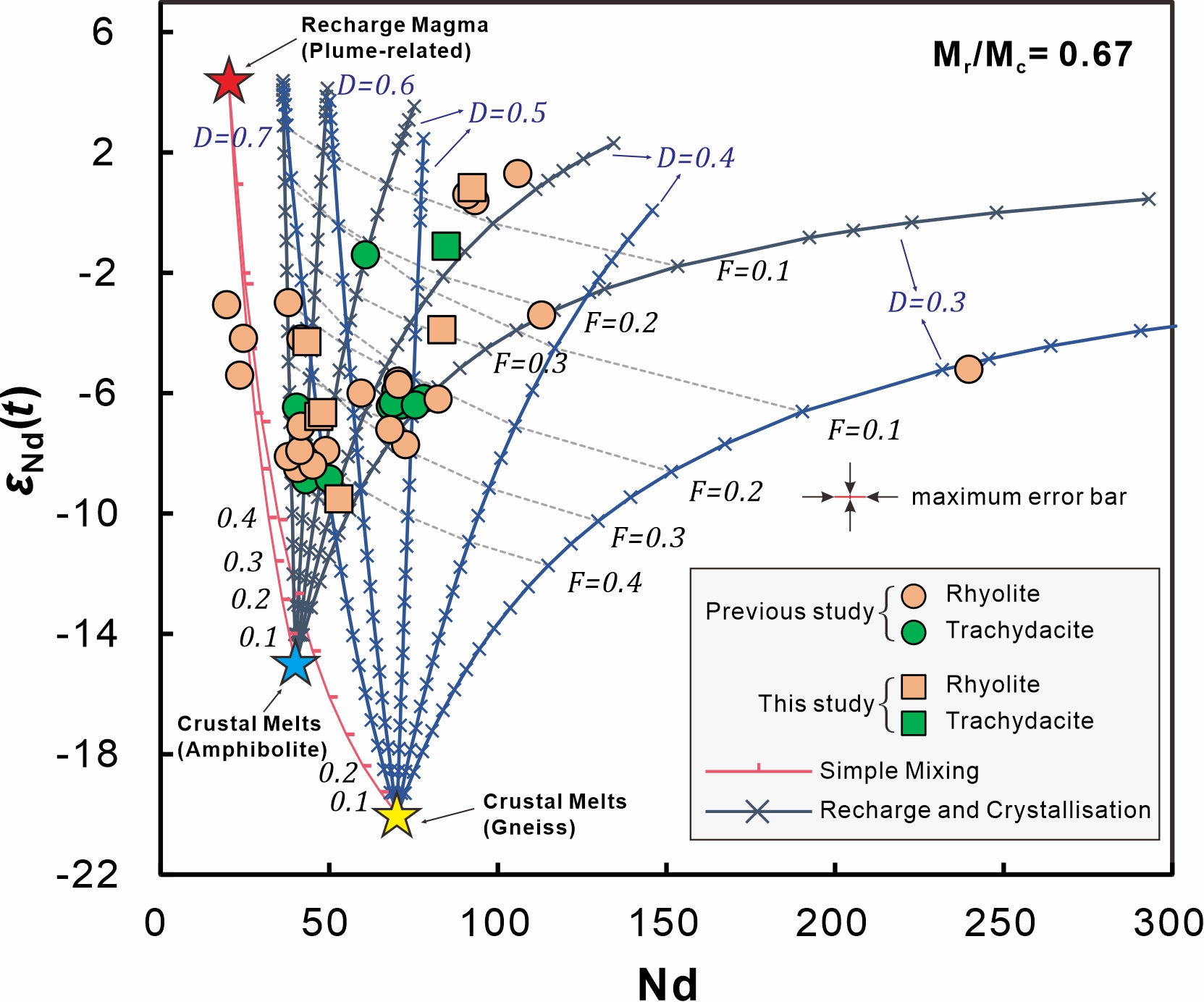 图2 长英质火山岩补给和结晶过程以及简单混合过程的Nd同位素模拟