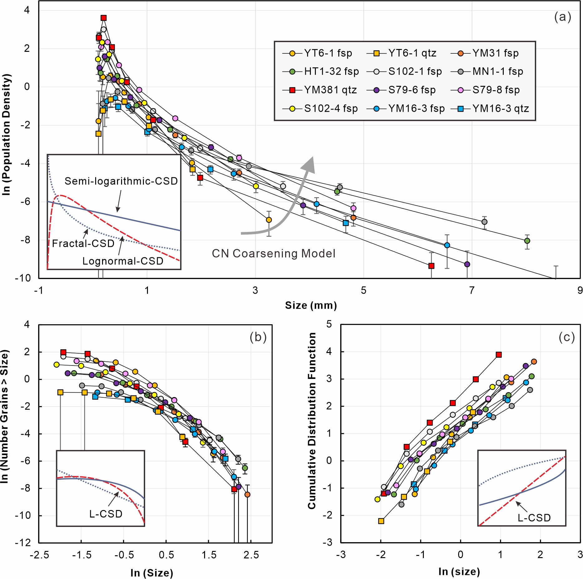(1)石英斑晶从核部到边部,Ti的含量总体升高,局部表现为周期性的快速上升和缓慢降低(图1),TitaniQ温度计测算结果表明其生长过程中的温度变化超过100℃,这种反环带的特征指示了镁铁质岩浆补充使得晶粥活化、然后缓慢冷却并结晶分异的演化过程, Nd同位素的数值模拟结果进一步支持了这一结果(图2);这些岩石中石英和长石的晶体分布呈现对数CSD的特征,指示了岩浆房中小晶体溶解与大晶体再生长的粗化过程(图3)。