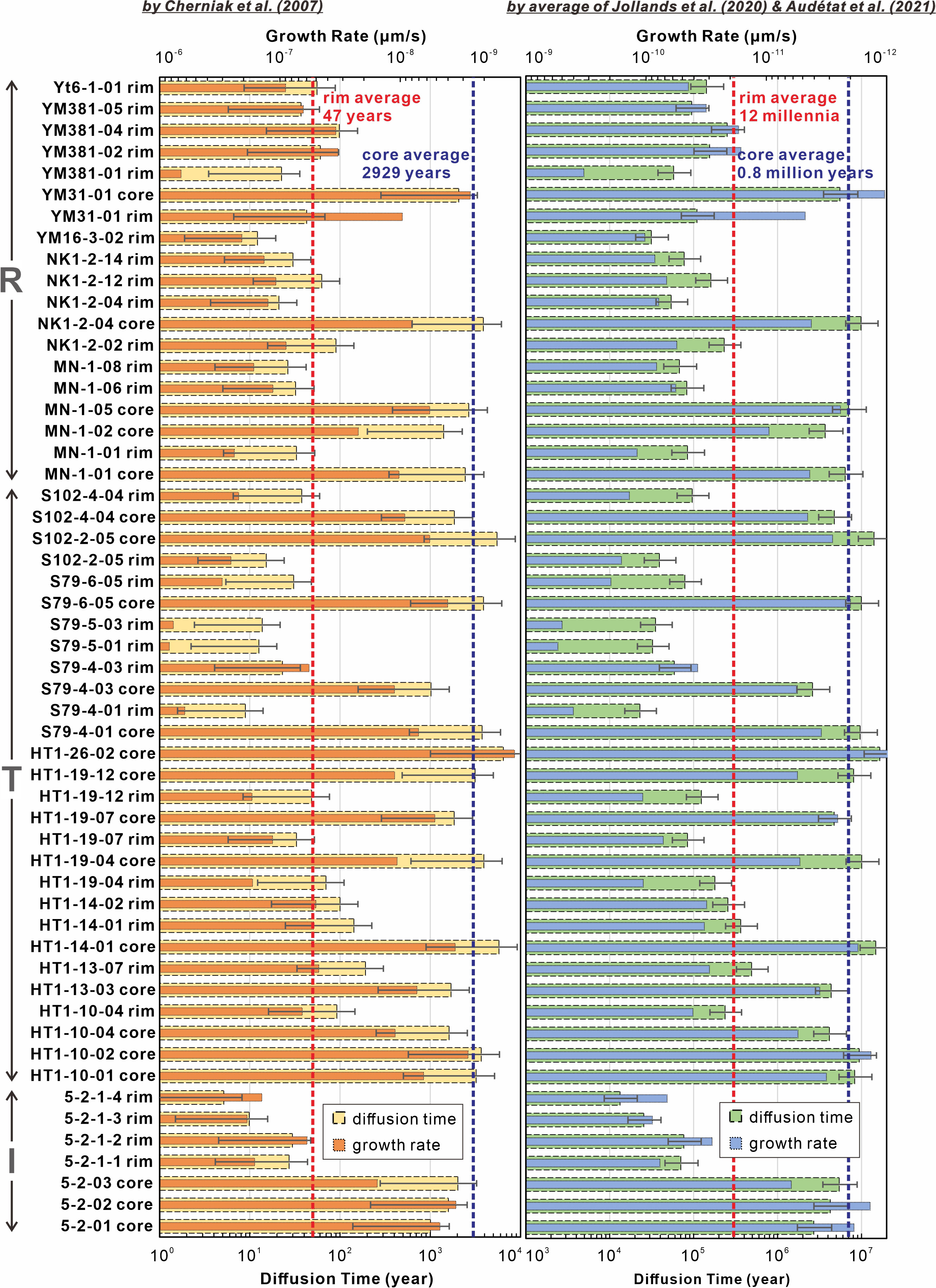 不同于Siberian、Deccan以及峨眉山等典型的镁铁质大火成岩省只有少量长英质岩石(<7%),塔里木大火成岩省长英质岩石的面积大约为48,000 km2,占总面积的18%,属于介于镁铁质大火成岩省和硅质大火成岩省之间的过渡型大火成岩省,阐明其长英质岩石比例高的原因对于理解硅质大火成岩省的形成机制以及硅质大火成岩省和镁铁质大火成岩省之间的成因联系具有重要的意义。解决为什么长英质岩石有如此高比例的关键是要揭示酸性岩浆在岩浆房中的演化过程,特别是岩浆的滞留时间,以及地幔柱与含水地壳相互作用如何影响酸性岩浆系统的演化进程。石英的Ti扩散计时法已被广泛用于计算酸性岩浆系统的岩浆滞留时间,并且对于多数研究程度较高的酸性岩浆中都给出了几十年到几千年的时间尺度。然而这些结果目前存在较大争议:一方面是因为这些结果与近年来高精度锆石U-Pb测年的结果具有很大出入,后者总体上比前者要高两个数量级;另一方面是由于近两年来新测定的Ti在石英中的扩散系数与此前学界广泛采用的数值有两到三个数量级的区别,因此必然会导致计算的滞留时间尺度存在巨大差别。