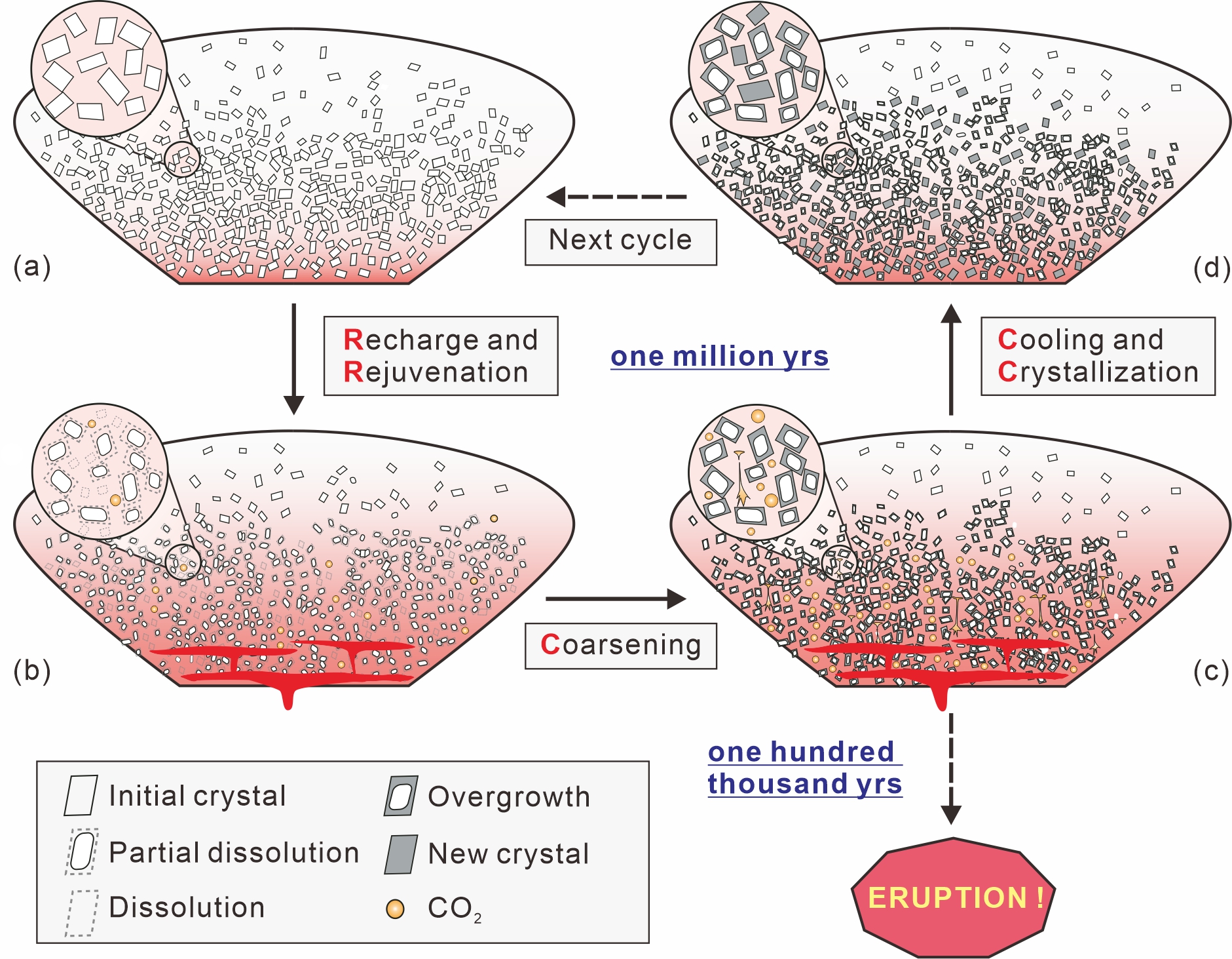 (3)基于最新报道的Ti在石英中的扩散系数,利用神经网络方法对石英核部和边部Ti扩散的拟合结果表明:晶粥再活化过程中岩浆补充的持续时间通常约为一百万年;而喷发前岩浆房内最后一次扰动的持续时间仅约为十万年(图4),这一结果与许多使用锆石U-Pb定年方法测定的酸性岩浆系统的绝对年龄差值基本一致;综合上述研究成果,提出塔里木酸性岩浆系统经历了周期性岩浆补充导致晶粥重熔(Recharge and Reactivation)、粗化(Coarsening)、结晶分异并冷却(Crystallization and Cooling)的岩浆房演化过程,并将其命名为RCC模式(图5)。