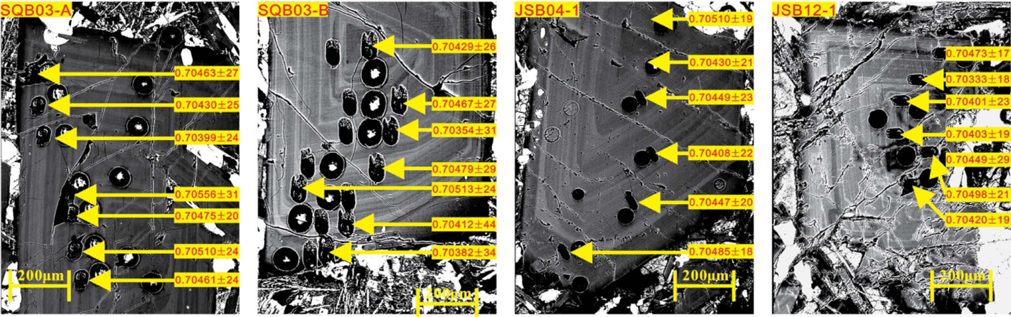 图2 带有锶同位素指示的斜长石样品BSE图像