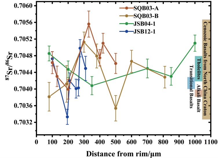 3. 斜长石晶体87Sr/86Sr采用分辨率为30μm的束斑进行分析,精度较高。87Sr/86Sr的变化范围为0.70333±0.00018(2SE)—0.70556±0.00031 (2SE),这一变化范围远远大于前人报道的汉诺坝玄武岩全岩,与华北新生代玄武岩的变化范围一致。