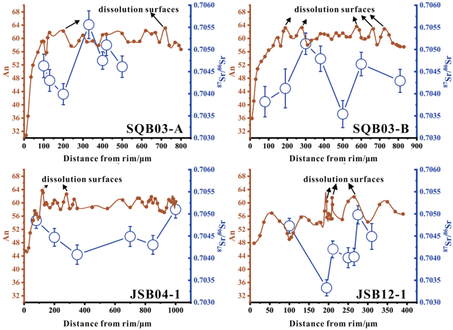 为进一步了解汉诺坝玄武岩在地壳和地幔深度的成分不均一性和岩浆作用机制,我校2021届本科毕业生苏宇通(现为北京大学21级直博生),在我校求真群体成员地球科学与资源学院副教授杨宗锋指导下,在详细的岩相学和地球化学特征研究的基础上,对于汉诺坝拉斑玄武岩中代表性的斜长石晶体进行了原位微量元素及原位锶同位素等的分析,取得以下认识: