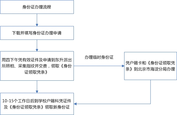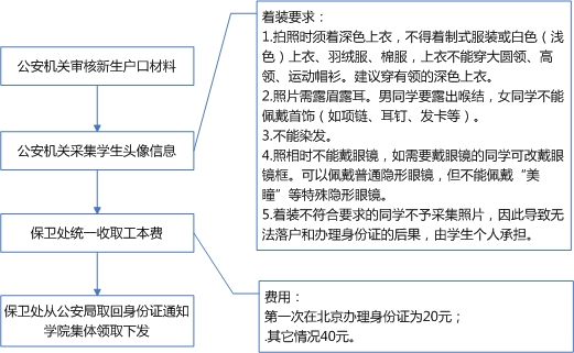 (一)入学新生将由保卫处统一办理北京身份证,办理流程如下所示