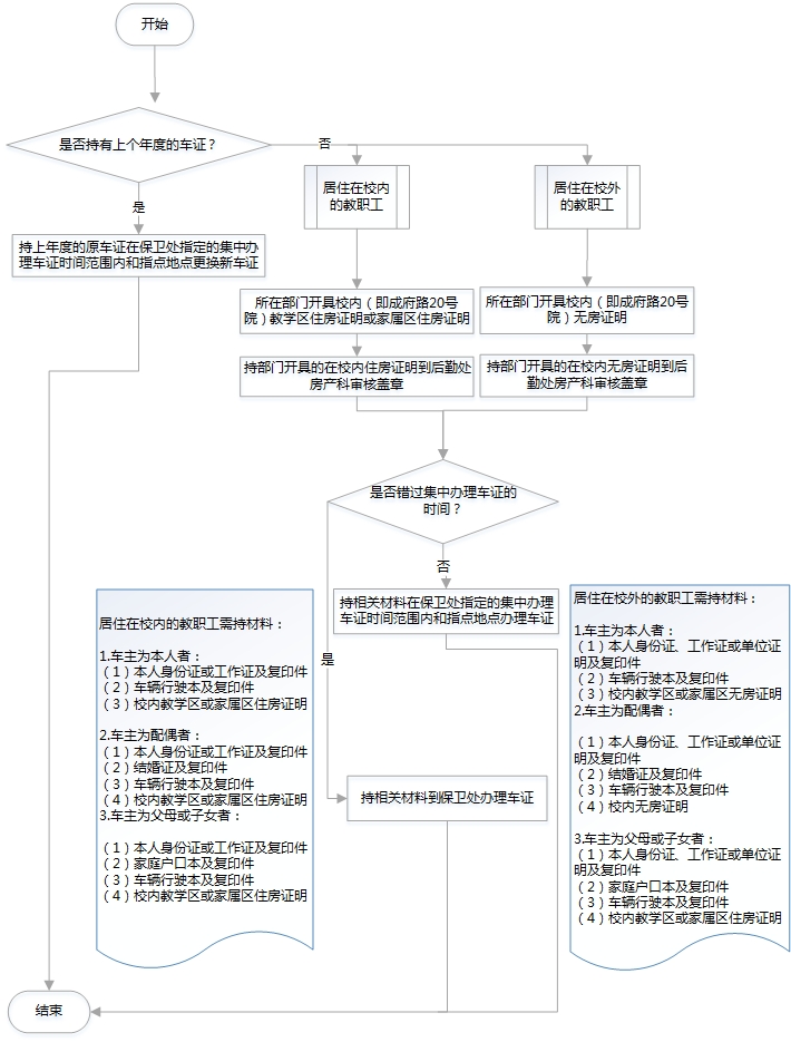 注:综合科研楼地库区、学生生活区及家属区集中办理车证一般在每年6月份,学19楼地下车库集中办理车证一般在每年12月份。每年集中办理车证前,学校保卫处会在校园内网及保卫处网站发布通知,请随时关注。