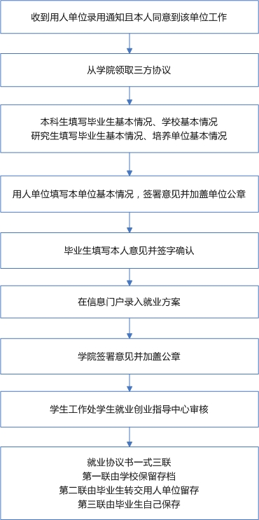 (1)就业协议书一式三联,学校、用人单位和毕业生各持一联。